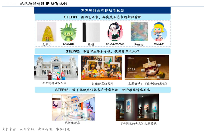 經(jīng)典案例:根據(jù)公司官網(wǎng)、澎湃新聞、華泰研究等綜合資訊表明,泡泡瑪特通過簽約知名網(wǎng)絡(luò)藝術(shù)家,夯實藝術(shù) IP 創(chuàng)新 的基礎(chǔ),保證源源不斷的高質(zhì)量 IP 供應(yīng)。同時公司通過推出 IP 家族系列閉環(huán)故事線,打造 IP 人物宇宙吸引消費者,推出相關(guān)主題音樂、線下城市樂園等活動,使得 IP 形象融入生活深入人心。