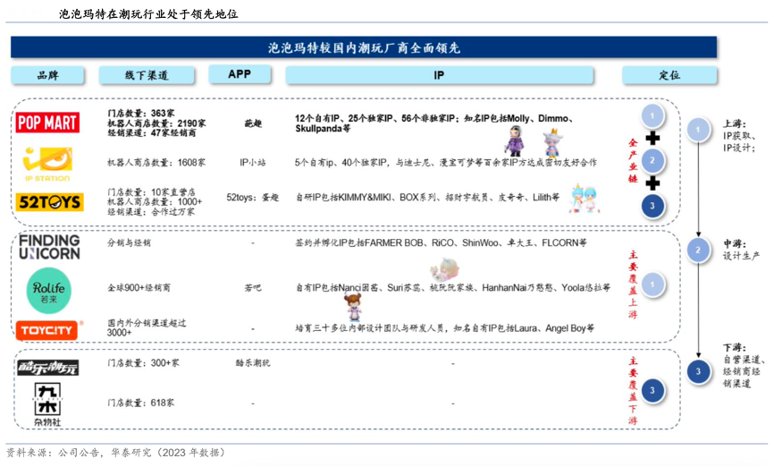經(jīng)典案例:根據(jù)公司公告、華泰研究等綜合資訊表明,泡泡瑪特 與名創(chuàng)優(yōu)品,均通過自身努力和不斷創(chuàng)新,實現(xiàn)了 IP 運營、產(chǎn)品設(shè)計、品牌、渠道和供應(yīng) 鏈全產(chǎn)業(yè)鏈打通,經(jīng)營業(yè)績亦實現(xiàn)持續(xù)快速成長,2023年泡泡瑪特中國內(nèi)地收入同比增 25.7%,名創(chuàng)優(yōu)品也實現(xiàn)了國內(nèi)線下 GMV 同比 39%的快速增長。