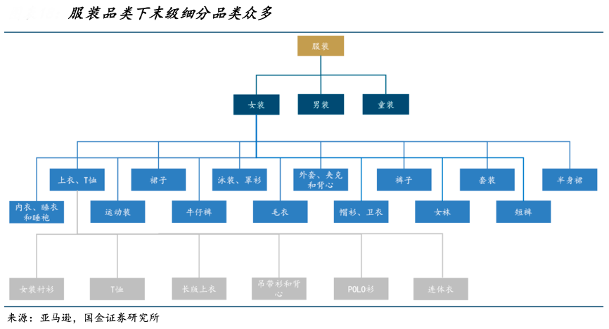 經(jīng)典案例:根據(jù)亞馬遜、國金證券研究所等綜合資訊表明,亞馬遜細(xì)分品類眾多,單品類提份額邏輯持續(xù)有效。以女裝為例,次級細(xì)分品類有內(nèi)衣、上衣、 T 恤、裙子等,而上衣、T恤這一次級細(xì)分品類又有女裝襯衫、T 恤、長版上衣等等末級品類,針對特定末級品類的產(chǎn)品布局,能夠迅速幫助服裝品牌打開市場,提高市場占有。