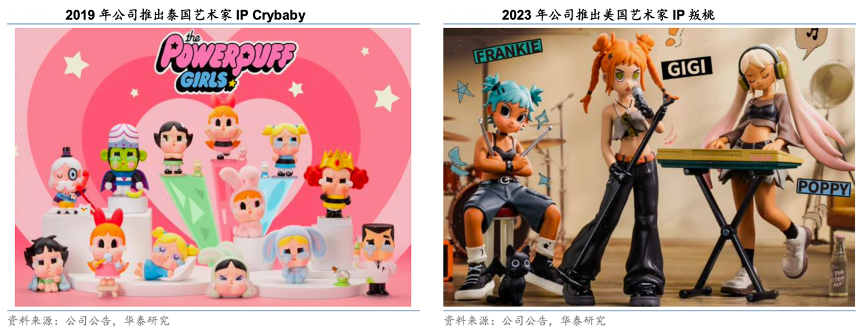 經(jīng)典案例:根據(jù)公司公告、華泰研究等綜合資訊表明,泡泡瑪特公司截至目前推出兩個主要的海外藝術(shù)家 IP——叛桃(PeachRiot)及Crybaby,前者在 23 年發(fā)布的首款盲盒產(chǎn)品成為公司美國市場當年單系列銷售額第一,而 Crybaby 在2023年成為泰國市場銷售額 TOP2 的IP,2024H1期間以 8.0%的自主產(chǎn)品收入占比躋身公司銷售額 TOP5 IP。