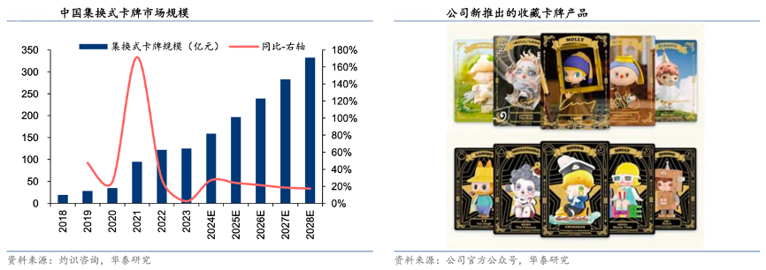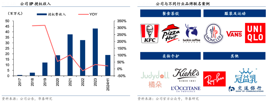 經(jīng)典案例:根據(jù)公司公告、公司官方公眾號、華泰研究等綜合資訊表明,泡泡瑪特伴隨其IP 影響力提升,目前已覆蓋包括餐飲、美妝、服裝、酒店、 食品飲料、運動鞋服等在內(nèi)的眾多行業(yè),帶動公司授權(quán)收入在 23 年達(dá)到 4,301 萬元。與知名消費品品牌的“強強聯(lián)合”能夠助力公司 IP 加速破圈,例如公司已與優(yōu)衣庫三度合作(分別以 Molly、the Monsters、Dimoo 三大 IP),聯(lián)名的 T 恤在全球的優(yōu)衣庫門店銷售。此外 2024 年以來公司 與瑞幸咖啡、安踏潮鞋的合作也引發(fā)了較高的社媒傳播熱度。