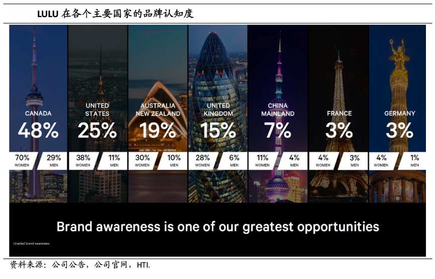 經(jīng)典案例:根據(jù)公司公告、公司官網(wǎng)、HTI.等綜合資訊表明,LULU不斷出新的產(chǎn)品系列,拓展核心客戶,就是不斷在尋找新的高消費(fèi)力的人群,為增長(zhǎng)帶來(lái)新的驅(qū)動(dòng)力。根據(jù) LULU 在 2023 年 9 月的分析師大會(huì)的數(shù)據(jù),LULU 品牌在加 拿大/美國(guó)/澳洲/英國(guó)/中國(guó)大陸/法國(guó)/德國(guó)的品牌認(rèn)知度分別為 48%/25%/19%/15%/7%/3%/3%,其中女性認(rèn)知度明顯高于男性認(rèn)知度。