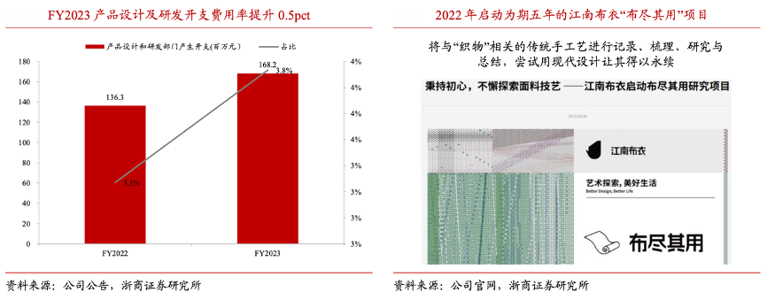 經(jīng)典案例:根據(jù)公司公告、公司官網(wǎng)、浙商證券研究所等綜合資訊表明,江南布衣通過(guò)差異化面料研發(fā)打造品牌藝術(shù)辨識(shí)度和產(chǎn)品舒適度,品質(zhì)感深入消費(fèi)者心智。2022 年啟動(dòng)為期五年的江南布衣“布盡其用”項(xiàng)目,F(xiàn)Y2023 公司產(chǎn)品設(shè)計(jì)及研發(fā)部門(mén)開(kāi)支同比 +23.4%至 1.7 億元,產(chǎn)品設(shè)計(jì)及研發(fā)開(kāi)支費(fèi)用率同比提升 0.5pct 至 3.8%,進(jìn)一步夯實(shí)從布料到生產(chǎn)的強(qiáng)大研發(fā)基底。