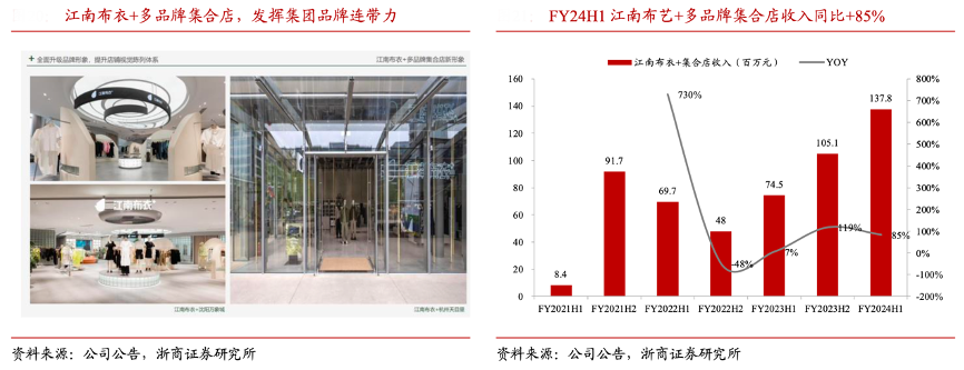 經(jīng)典案例:根據(jù)公司公告、浙商證券研究所等綜合資訊表明,江南布衣通過(guò)“不止盒子私人搭配”、“跨品牌會(huì)員權(quán)益”、“免運(yùn)費(fèi)寄送”、“服裝高端洗護(hù)”等會(huì)員專(zhuān)屬體驗(yàn)的消費(fèi)場(chǎng)景,加強(qiáng)粉絲粘性。FY2023H2、FY2024H1 江南布衣+集合店收入同比分別+119%、+85%至 1.05、 1.38 億元,彰顯集團(tuán)品牌連帶力與新渠道的快速增長(zhǎng)。
