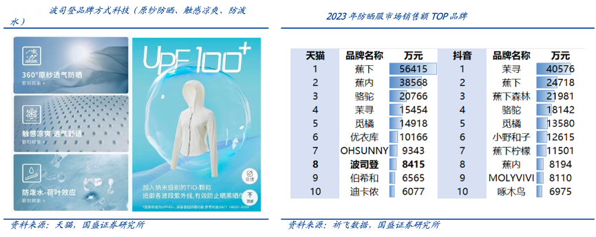 經(jīng)典案例:根據(jù)天貓、祈飛數(shù)據(jù)、國盛證券研究所等綜合資訊表明,波司登專業(yè)科技性能領先,注重 持久防曬、瞬間涼感及透氣舒適等功能,數(shù)百次水洗后 UPF 值仍保持 UPF100+ (遠高于國標要求 UPF40+)。同時據(jù)祈飛數(shù)據(jù)及公司官 網(wǎng),波司登 2023 年在天貓平臺防曬服類目銷售額排名第 8 位/在中高端防曬服市場位列龍頭位置,目前在中高端防曬服消費市場已經(jīng)形成較好的口碑。