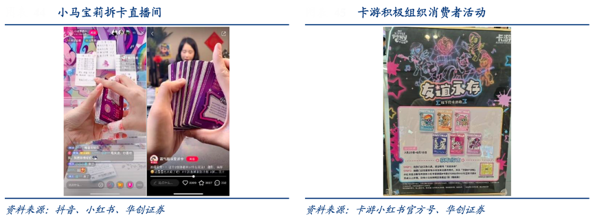 經(jīng)典案例:根據(jù)抖音、小紅書、卡游小紅書官方號(hào)、華創(chuàng)證券等綜合資訊表明,卡游品牌往往圍繞 IP 進(jìn)行卡牌內(nèi)容創(chuàng)作與產(chǎn)品設(shè)計(jì),精心設(shè)計(jì)稀有度系 統(tǒng)與互動(dòng)玩法設(shè)計(jì),并結(jié)合先進(jìn)生產(chǎn)工藝,開發(fā)出消費(fèi)者喜愛的卡牌產(chǎn)品;如系列卡牌推出時(shí)線下地推,線上直播推廣,積極組織玩家卡牌活動(dòng)以提升玩家粘性等。