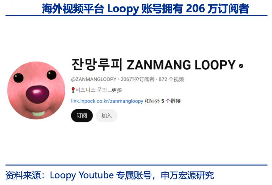 經(jīng)典案例:根據(jù)Loopy Youtube專屬帳號(hào)、申萬(wàn)宏源研究等綜合資訊表明, Loopy 原是 2001 年動(dòng)畫(huà)《小企鵝 Pororo》角色,2022 年通過(guò) ICONIX 在海外視頻平臺(tái)運(yùn)營(yíng)的專屬賬號(hào), 以打工 vlog、直播和綜藝內(nèi)容重塑為虛擬女明星,吸引了 206 萬(wàn)訂閱者,成為現(xiàn)象級(jí) IP。其社恐特質(zhì)引起新入職年輕人共鳴,引發(fā)了二創(chuàng)表情包風(fēng)潮,進(jìn)一步鞏固其頂級(jí) IP 地位。