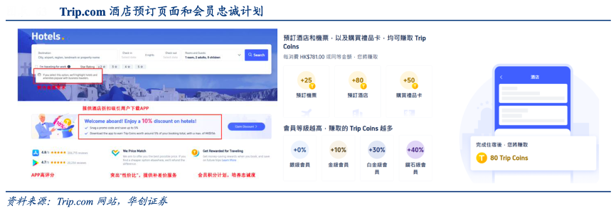 經(jīng)典案例:根據(jù)Trip.com網(wǎng)站、華創(chuàng)證券等綜合資訊表明,當(dāng)前 Trip.com 提供最惠價格保證,若用戶在其他平臺尋得更低價格提供補差價服務(wù),突出“性價比”。同時平臺為加強用戶粘性和讓利消費者,除享有對應(yīng)會員等級的折扣外,另提供積分抵扣訂單金額計劃,100 trip coin=1USD,會員等級越高獲取積分比例越高。