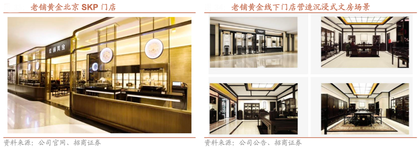 經(jīng)典案例:根據(jù)公司官網(wǎng)、公司公告、招商證券等綜合資訊表明,老鋪黃金目前在全國(guó)十大高端購(gòu)物中心覆蓋率為 80%,僅次于寶格麗、卡地亞等品牌。在消費(fèi)場(chǎng)景建設(shè)上,公司探索并建立了古法黃金線下情景化經(jīng)營(yíng)的新模式,以經(jīng)典、雅致的中國(guó)文房場(chǎng)景為主題,從聲、光、嗅等多方面精細(xì)布置,提供沉浸式的傳統(tǒng)經(jīng)典文化意境。