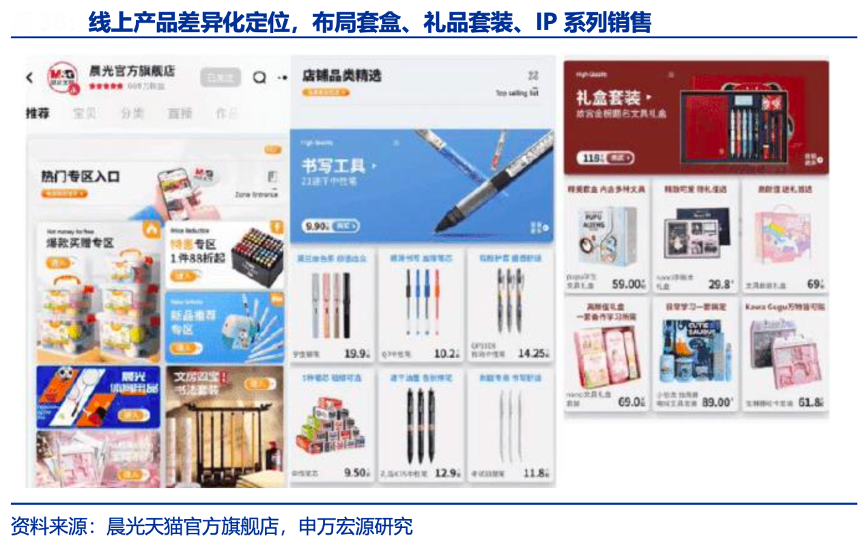 經(jīng)典案例:根據(jù)晨光天貓官方旗艦店、申萬(wàn)宏源研究等綜合資訊表明,晨光股份公司線上產(chǎn)品開(kāi)發(fā)與各賽道共同構(gòu)建開(kāi)發(fā)節(jié)奏、標(biāo)準(zhǔn)與流程,優(yōu)化直 營(yíng)業(yè)務(wù)結(jié)構(gòu),探索優(yōu)化爆品打造方法;差異化開(kāi)發(fā)提升市場(chǎng)占有率,各賽道細(xì)分品類如食品級(jí)馬克筆、超輕粘土、縫線本、削筆器等表現(xiàn)優(yōu)異,線上客單價(jià)保持提升趨勢(shì)。
