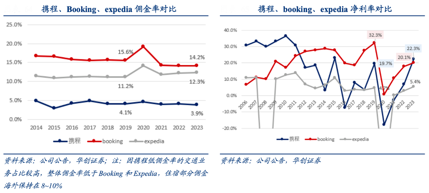 經(jīng)典案例:根據(jù)公司公告、華創(chuàng)證券等綜合資訊表明,基于出境游和 Trip.com 供應(yīng)鏈的打通,依靠攜程在國內(nèi)已經(jīng)打磨得相對成熟的產(chǎn)品體系、管理模式,即使在相對低位的傭金率條件下,2023 年 Trip.com 已實(shí)現(xiàn)自身平臺邊際收益 層面的盈虧平衡。整體集團(tuán)層面看,2023 年攜程凈利率水平達(dá)到 22.3%,高于 Booking (20.1%)和 Expedia(5.4%)。