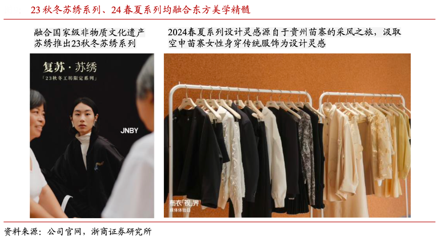 經(jīng)典案例:根據(jù)公司官網(wǎng)、浙商證券研究所等綜合資訊表明,江南布衣公司產(chǎn)品設(shè)計(jì)不斷從傳統(tǒng)文化中汲取靈感,在設(shè)計(jì)上融合東方美學(xué)精髓、傳統(tǒng)工藝和圖案,JNBY 23 秋冬融合國(guó)家非物質(zhì)文化遺產(chǎn)推出蘇繡系列,24 春夏系列融合空申苗寨女性傳統(tǒng)服飾,彰顯出獨(dú)特設(shè)計(jì)風(fēng)格與藝術(shù)氣息。
