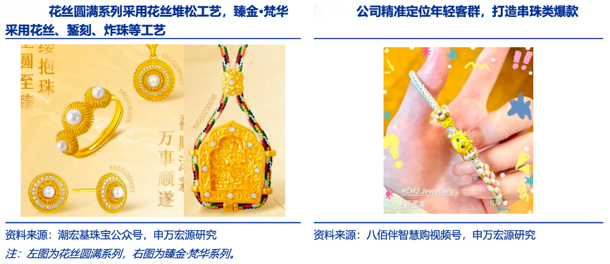 經(jīng)典案例:根據(jù)潮宏基珠寶公眾號、八佰伴智慧購視頻號、申萬宏源研究等綜合資訊表明,潮宏基伴隨著黃金工藝的進步,創(chuàng)意能夠通過古法金、硬金實現(xiàn),公司所積累的設(shè)計研發(fā)能力進一步賦能純金產(chǎn)品,例如 2024 年新品花絲圓滿系列采用花絲堆松工藝、臻金·梵華采用花絲、鏨刻、炸珠等工藝。另外,公司精準(zhǔn)定位年輕客群,打造串珠類爆款,并通過小紅書等社交平臺的種草傳播成為網(wǎng)紅產(chǎn)品。