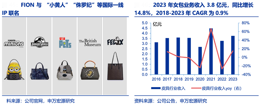經(jīng)典案例:根據(jù)公司官網(wǎng)、公司公告、申萬宏源研究等綜合資訊表明,2014 年潮宏基對菲安妮完成全資收購,當(dāng)年菲安妮門店數(shù)量超過 300 家,F(xiàn)ION強化年輕時尚、藝術(shù)生活化的品牌理念,開始與全球不同領(lǐng)域藝術(shù)家合作,與“小黃人”“侏羅紀(jì)”“阿凡 達(dá)“等國際一線 IP 聯(lián)名,并孵化自主 IP“小怪獸”系列。2023 年女包業(yè)務(wù)收入 3.8 億元, 同比增長 14.8%,2018-2023年 CAGR 為 0.9%。