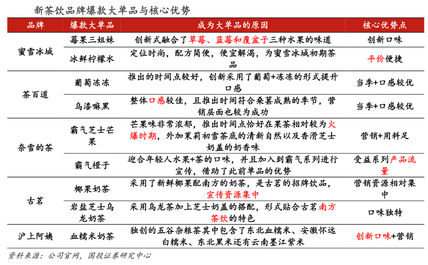 經(jīng)典案例:根據(jù)公司官網(wǎng)、國投證券研究中心等綜合資訊表明,新品浪潮迭代,爆款大單品銷量穩(wěn)定,蜜雪冰城推出的冰鮮檸檬水以其平價便捷口感使得其成為爆款商品風(fēng)靡全國,茶百道抓住茶飲融合桑葚契機(jī),以爽口的口感與較好的營銷使其快速成為代表性大單品。
