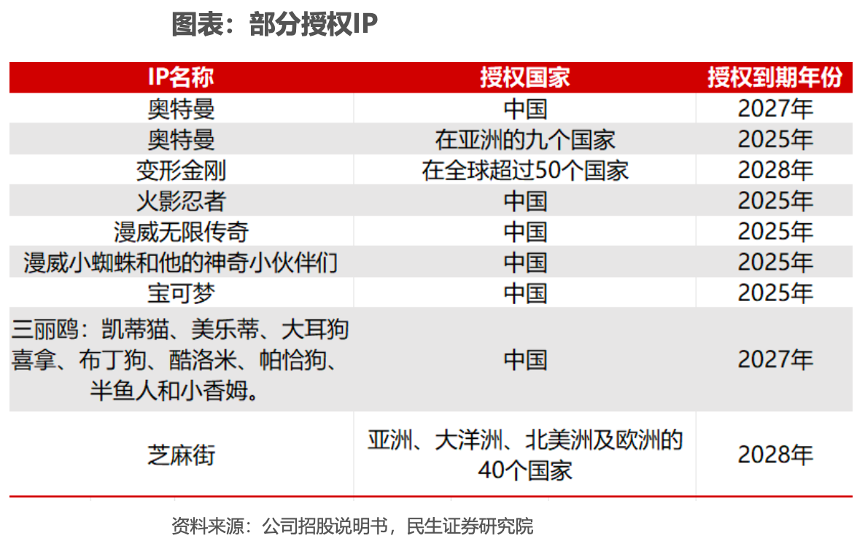 經(jīng)典案例:根據(jù)公司招股說明書、民生證券研究院等綜合資訊表明,布魯可成功地開發(fā)了與粉絲產(chǎn)生共鳴的產(chǎn)品,并有效商業(yè)化了IP,成為知名IP版權(quán)方的優(yōu)選合作伙伴。布魯可與授權(quán)方簽訂了授權(quán)協(xié)議,獲得了在中國(guó)及海外地區(qū)開發(fā)和銷售玩具的權(quán)利。布魯可的授權(quán)IP矩陣覆蓋了不同年齡段和性別的多個(gè)受歡迎IP,截至2024年3月31 日,共有30多個(gè)授權(quán)IP,227款在售SKU。