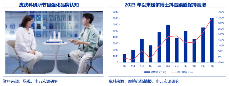 經(jīng)典案例:根據(jù)品觀、魔鏡市場(chǎng)情報(bào)、申萬宏源研究等綜合資訊表明,在微生態(tài)護(hù)膚的心智搭建上,璦爾博士在《皮膚的真相》《專家請(qǐng)指教》 《皮膚科研所》系列短視頻中,邀請(qǐng)上海市皮膚病醫(yī)院專家鄒穎、重慶醫(yī)科大學(xué)附屬第一 醫(yī)院皮膚陳瑾教授、知名 KOL 楊若天、璦爾博士首席研發(fā)師李燕等專家、科研人員走到臺(tái) 前,直面消費(fèi)者需求,實(shí)現(xiàn)營(yíng)銷和科普的“跨界融合”。在專家+達(dá)人的 線上營(yíng)銷體系下,自 2023 年下半年開始,璦爾博士抖音渠道銷售額連續(xù)保持三位數(shù)高速增 長(zhǎng)。