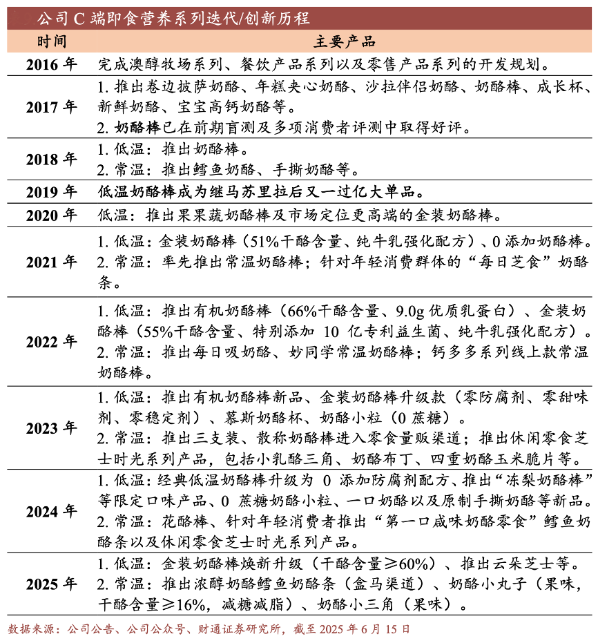 經(jīng)典案例:根據(jù)公司公告、公司公眾號(hào)、財(cái)通證券研究所等綜合資訊表明,妙可藍(lán)多公司依托業(yè)內(nèi)領(lǐng)先的研發(fā)能力,實(shí)現(xiàn)奶酪產(chǎn)品的持續(xù)迭代升級(jí)。自 2018 年低溫奶酪棒上市以來,公司針對(duì)奶酪棒的口味、營(yíng)養(yǎng)、干酪含量等各維度不斷迭代升級(jí),陸續(xù)推出了零添加金裝奶酪棒、高鈣奶酪棒、奇炫奶酪棒等升級(jí)品類,并于 2021 年推出常溫奶酪棒,拓寬了奶酪棒產(chǎn)品的渠道和消費(fèi)場(chǎng)景。