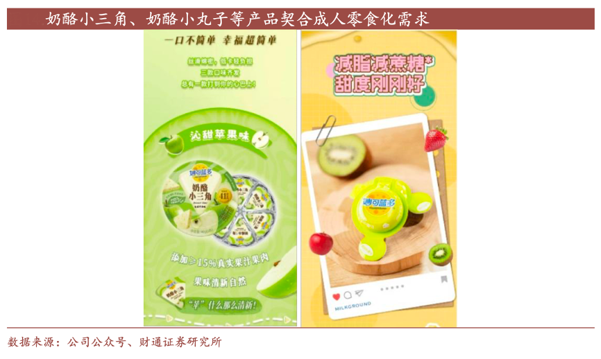 經(jīng)典案例:根據(jù)公司公眾號(hào)、財(cái)通證券研究所等綜合資訊表明,妙可藍(lán)多公司基于市場(chǎng)趨勢(shì)提出“奶酪+”戰(zhàn)略。如2025 年公司推出減糖減脂的奶酪小丸子與奶酪小三角等健康化零食,并開發(fā)便于攜帶、分享的小包裝產(chǎn)品,持續(xù)破圈成人消費(fèi)群體。