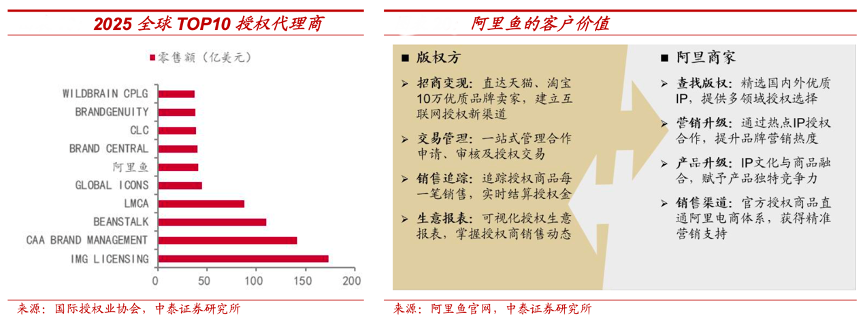 經(jīng)典案例:根據(jù)國際授權(quán)業(yè)協(xié)會、阿里魚官網(wǎng)、中泰證券研究所等綜合資訊表明,阿里魚為阿里巴巴旗下在線版權(quán)交易服務(wù)平臺,為國內(nèi)外版權(quán)方和優(yōu)質(zhì)品牌商家,提供一站式互聯(lián)網(wǎng)授權(quán)方案。以大數(shù)據(jù)匹配為核心,包含授權(quán)交易、授權(quán)管理、 聯(lián)合營銷、在線銷售、自動分賬等服務(wù)。阿里魚為 IP 方提供變現(xiàn)新渠道: 直達(dá) 10 萬精選品牌和 4.34 億活躍買家。