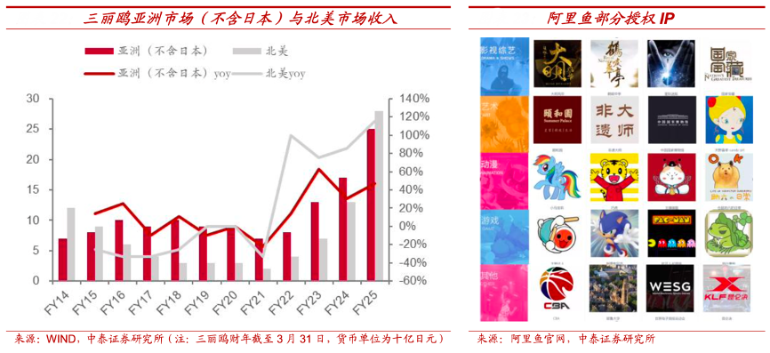 經(jīng)典案例:根據(jù)WIND、阿里魚官網(wǎng)、中泰證券研究所等綜合資訊表明,阿里魚自 2016 年成立以來,阿里魚目前擁有的 IP 矩陣覆蓋了二次元、文博文創(chuàng)、影視綜藝、教 育體育等多個 IP 類型,簽約了三麗鷗家族、寶可夢、環(huán)球影業(yè)、蠟筆小 新、Chiikawa 等多個全球優(yōu)質(zhì)頭部 IP。